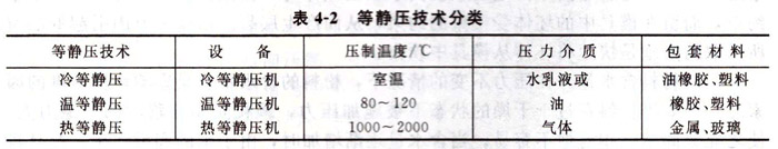 (2)等靜壓成型類型等靜壓技術按其成型和固結時溫度的高低,一般可分為三種:冷等靜壓(CIP)、溫等靜壓(WIP)和熱等靜壓(HIP)。由于等靜壓時溫度的差別,因此三種等靜壓技術分別采用了相應的設備、壓力介質和包套模具材料,如表4-2所示。